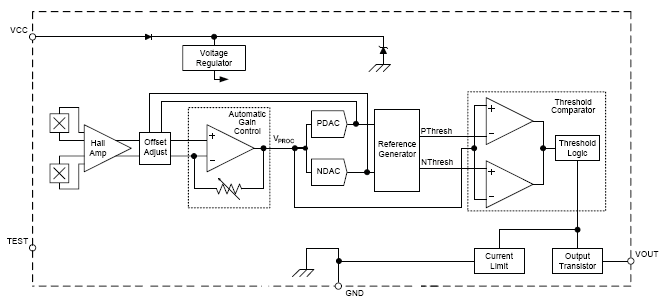 The device incorporates a dual element Hall IC that switches in response to differential magnetic signals created by a ferromagnetic target. The IC contains a sophisticated compensating circuit designed to eliminate the detrimental effects of magnet and system offsets. Digital processing of the analog signal provides zero-speed performance independent of air gap and also dynamic adaptation of device performance to the typical operating conditions found in automotive applications (reduced vibration sensitivity). High-resolution peak detecting DACs are used to set the adaptive switching thresholds of the device. Hysteresis in the thresholds reduces the negative effects of any anomalies in the magnetic signal associated with the targets used in many automotive applications.