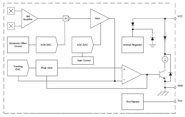 The ATS642 is an optimized Hall IC providing a user-friendly solution for true zero-speed digital gear-tooth sensing in two-wire applications. The device consists of a single-shot molded plastic package that includes a samarium cobalt pellet, a pole piece, and a Hall effect IC that has been optimized to the magnetic circuit. This small package, with optimized two-wire leadframe, can be assembled simply and used in conjunction with a wide variety of gear shapes and sizes.