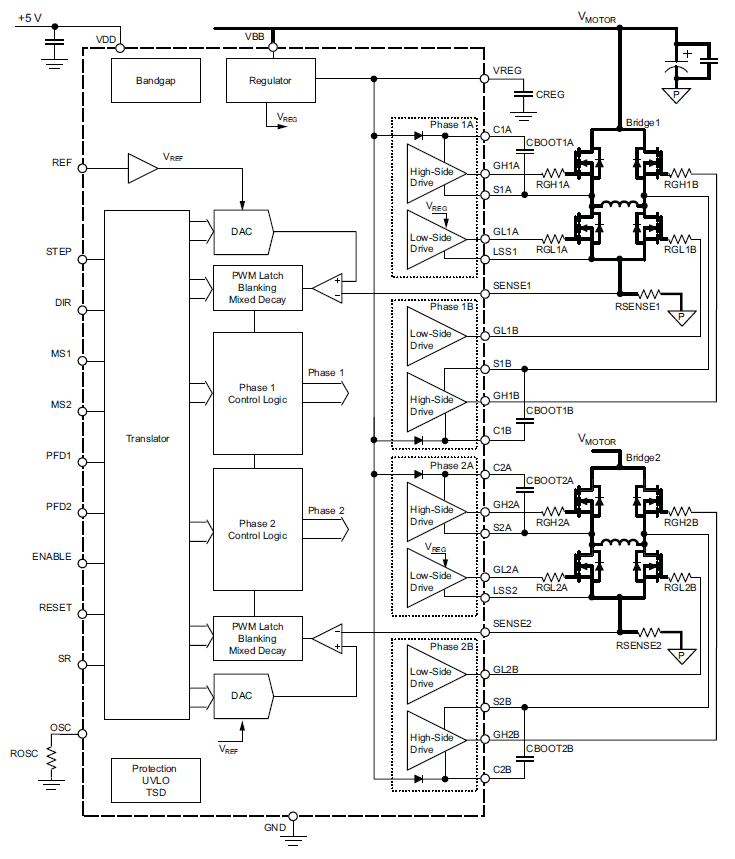 This device contains two sinusoidal DACs that generate the reference voltage for two separate fixed-off-time PWM current controllers. These provide current regulation for external power MOSFET full-bridges.