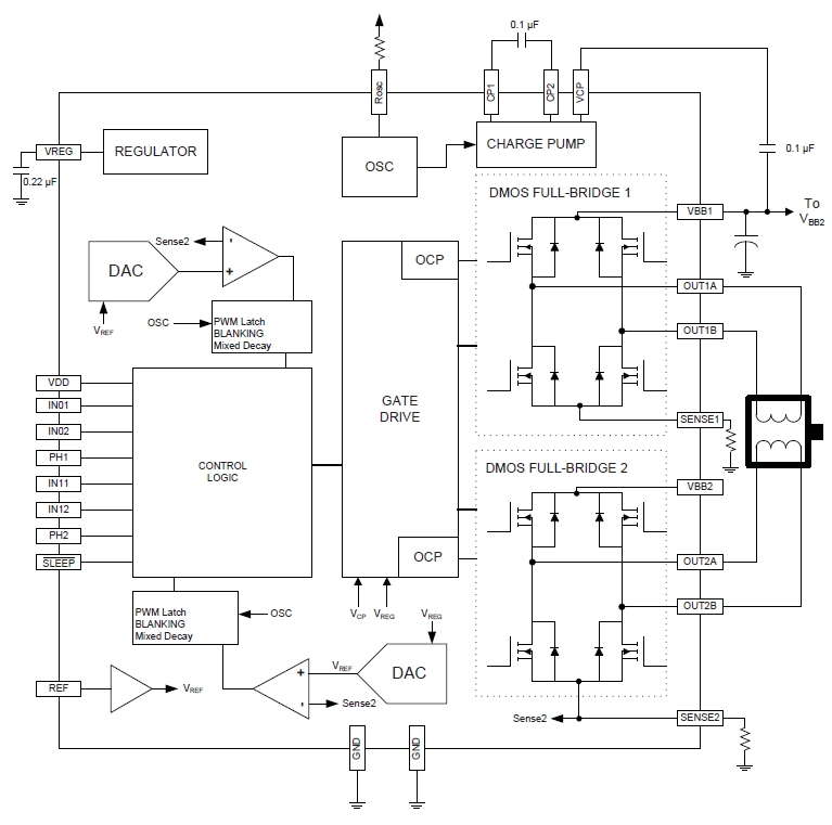 DMOS Dual Full-Bridge PWM Motor Driver with Parallel Inputs and Overcurrent Protection