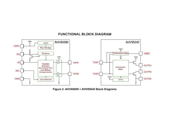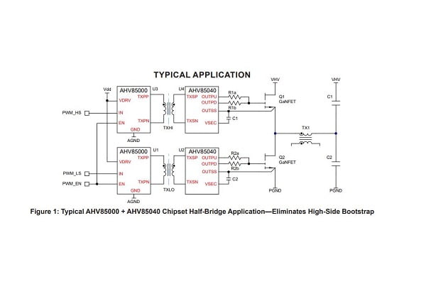 The AHV85000/40 chipset provides a cost-effective and highly integrated solution for isolated gate drive of GaN FETs, eliminating the need for a separate bias supply and simplifying system design.