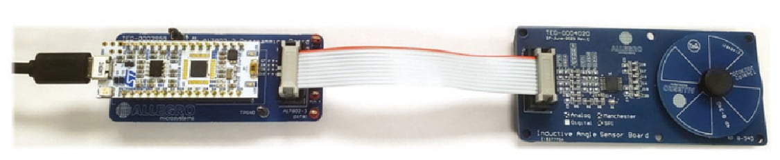 The kit features a four-cycle coil design printed on the sensor board, a rotatable four-cycle target mounted atop the board, a microcontroller that decodes sensor data, and a Windows application downloadable from the Allegro software website
