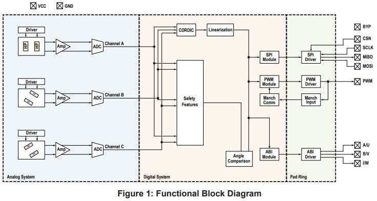 The A33023 is a 360° angle sensor IC for high-resolution angular position with low 25µs latency. It offers multiple output options (SPI, PWM, UVW, ABI), integrated linearization, and targets ASIL D compliance, making it ideal for fast, safety-critical automotive applications, qualified to AEC-Q100.