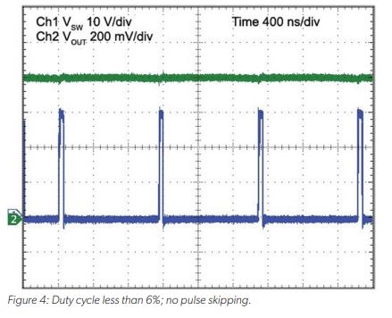 With an on-time of 63 ns, many peak current mode control solutions are unable to achieve the desired duty cycle. Consequently, the converters operate in either a pulse-skipping or burst-mode (as shown previously) to obtain the correct output DC voltage. These modes of operation typically create an excessive (AC) ripple voltage to appear on the output.