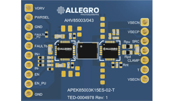 The Allegro MicroSystems APEK85003K15ES-02-MH is an evaluation board for the AHV85003 and AHV85043 isolated SiC driver chipset. This driver provides a self-powered isolated gate drive solution for SiC FETs.