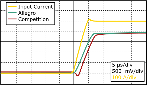 获得专利的片上屏蔽电路可减少由于高电压切换(高 dv/dt)导致的输出错误。此外,与大多数分流 + 运算放大器解决方案不同,霍尔效应感应方法不受高 di/dt 事件引起的电感尖峰的影响。