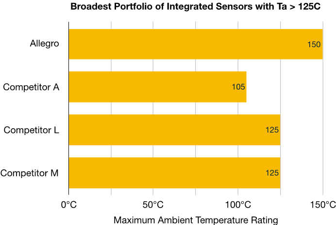 Allegro 具有广泛的集成电流传感器系列,其环境温度额定值高达 150°C!我们不断扩充的产品组合提供近 20 款“L-Temp”电流传感器,您肯定能够找到满足所有汽车和工业需求的可靠电流传感器。