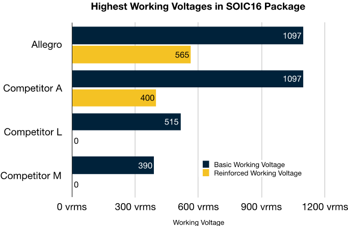 我们的封装在 SOIC-16 尺寸下具有最高的工作电压。