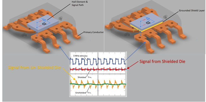 Patented on-chip shield circuitry reduces output errors due to high-voltage switching (high dv/dt). Additionally, the Hall-effect sensing method is immune to inductance spikes from high di/dt events, unlike most shunt plus op-amp solutions.